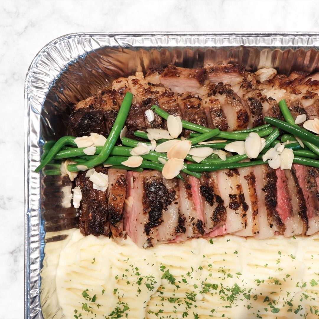 Savor the rich, comforting flavors of our Roast Beef with Black Pepper Sauce, featuring tender, slow-roasted beef slices paired with creamy mashed potatoes and crisp green beans. A hearty and elegant platter perfect for festive gatherings and special celebrations.